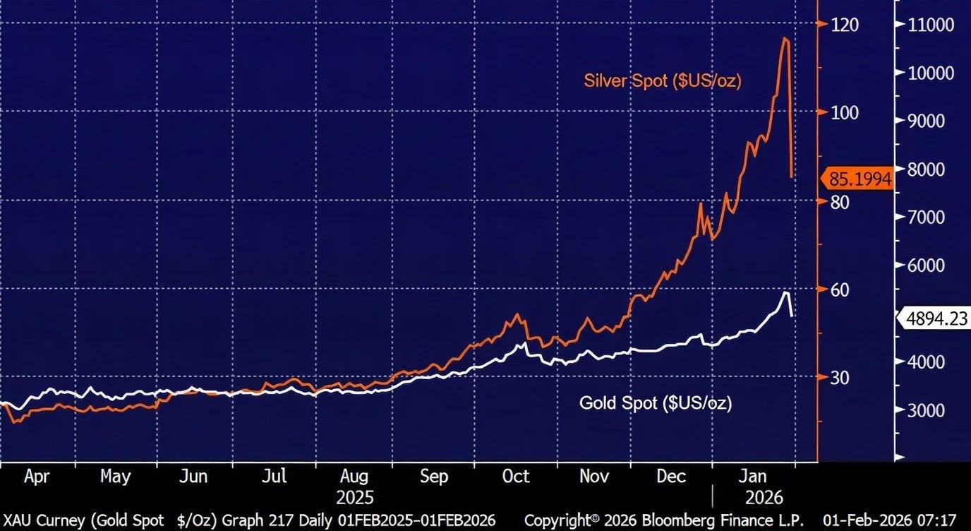 Over the past week, commodity markets - particularly precious metals – were sold off sharply. Gold fell by roughly US$900 per ounce (-16%) in less than two days, while silver declined even more aggressively, at one point falling close to 40%. The speed of the move was almost more shocking, with prices briefly dropping more than 7% in a matter of minutes before stabilising. Moves of this nature are typically not driven by a sudden change in long-term fundamentals, but by crowded positioning and leverage being forced out of the system.