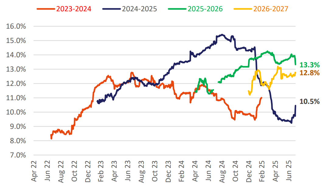 Trade policy remains an additional source of uncertainty. The White House has negotiated a series of trade “deals” that appear to raise the weighted average US tariff rate from around 16% to potentially 19%, with the European Union representing the most significant swing factor. While these measures have so far avoided the most punitive outcomes, they underscore a backdrop of elevated trade frictions that could weigh on global supply chains and corporate sentiment.